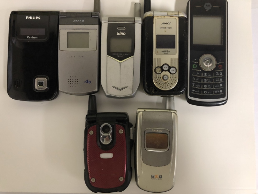 (请求人提交七款旧手机试图作为使用公开证据,从左至右、从上到下依次为:飞利浦9@9r、夏新A8、波导V08、夏新M66、摩托罗拉W161、松下X77、三星SGH-S508)