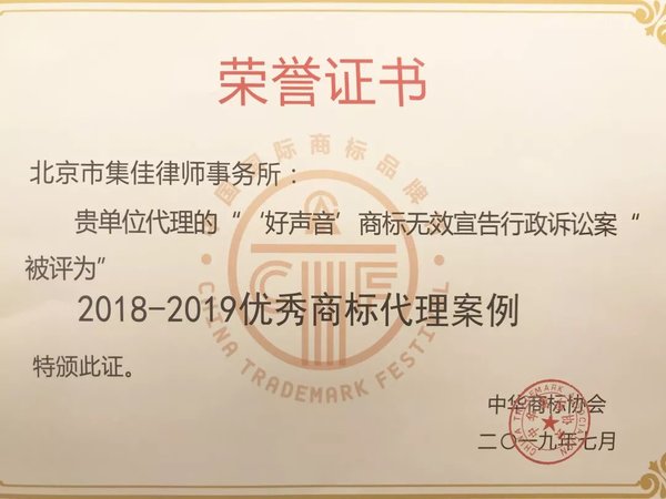 >极速电竞>关于我们>荣誉概览>2019>集佳代理“好声音”商标无效宣告行政案入选“优秀商标代理案例”