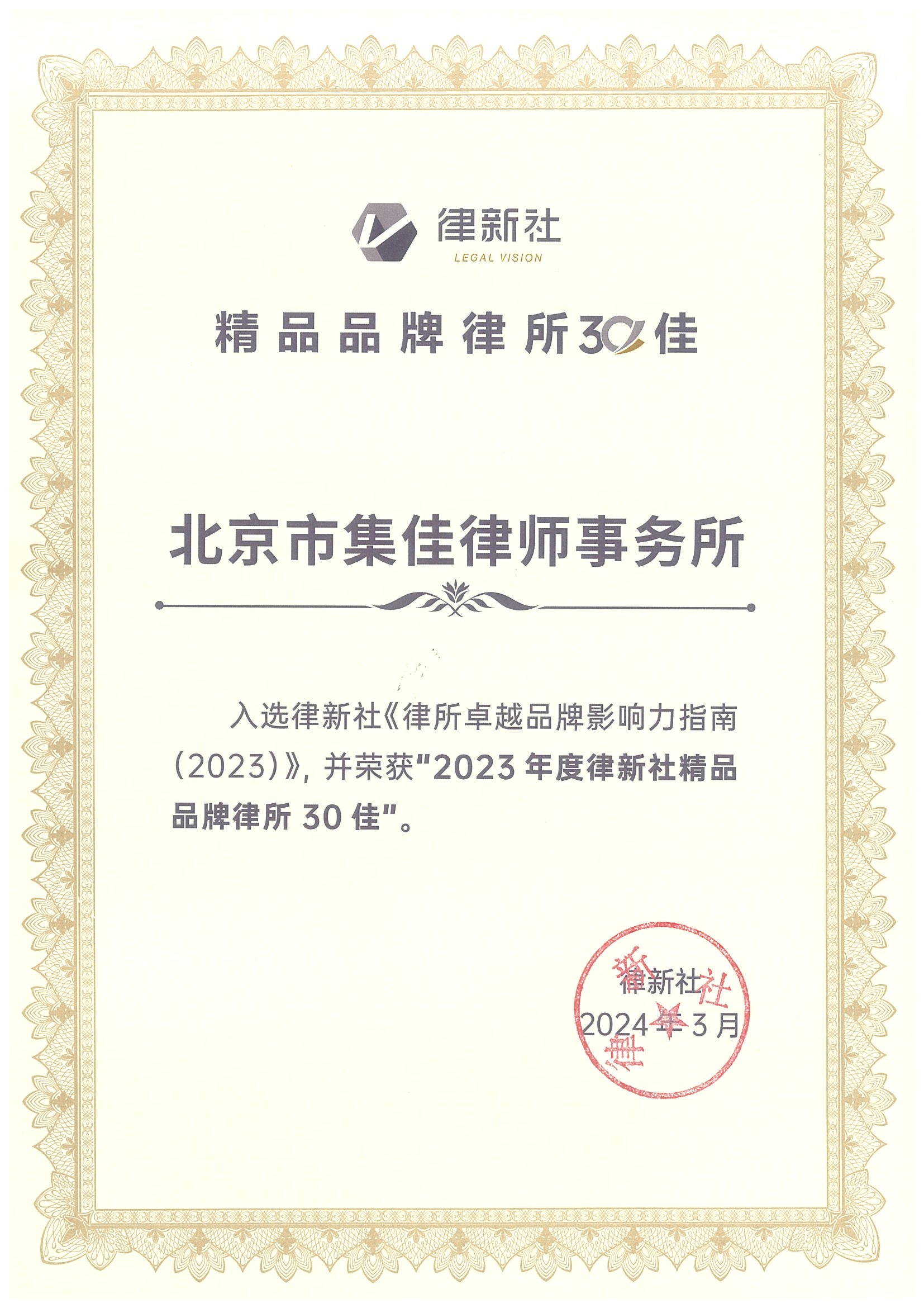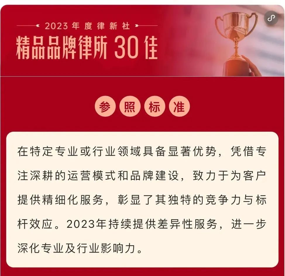 2024年3月2日,由中国法学交流基金会指导、律新社主办的“致·追光者”第二届法律服务业品牌发展论坛暨律新社2023年度品牌盛典隆重举行,现场发布了备受关注的《律所卓越品牌影响力指南(2023)》,极速电竞凭借在知识产权领域的卓越实力和良好口碑,荣登“2023年度律新社精品品牌律所30佳”榜单。