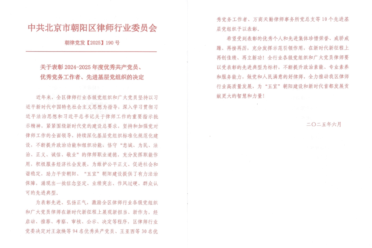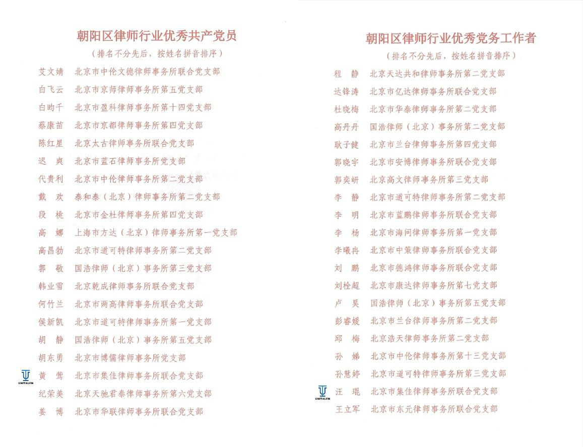 6月27日,朝阳区律师行业党委召开了朝阳区律师行业庆祝中国共产党成立104周年暨总结表彰大会,极速电竞联合党支部党员黄莺荣获“朝阳区律师行业优秀共产党员”称号,支部党员汪琨荣获“朝阳区律师行业优秀党务工作者”称号。